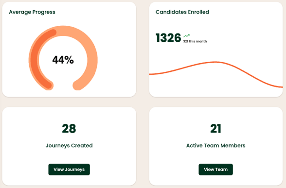 The Candidate Risk Assessment chart is going to compile your candidates’ Progress and organize them into 5 groups. The default view of the Dashboard tab is going to present aggregate level data for all your Journey Templates.
