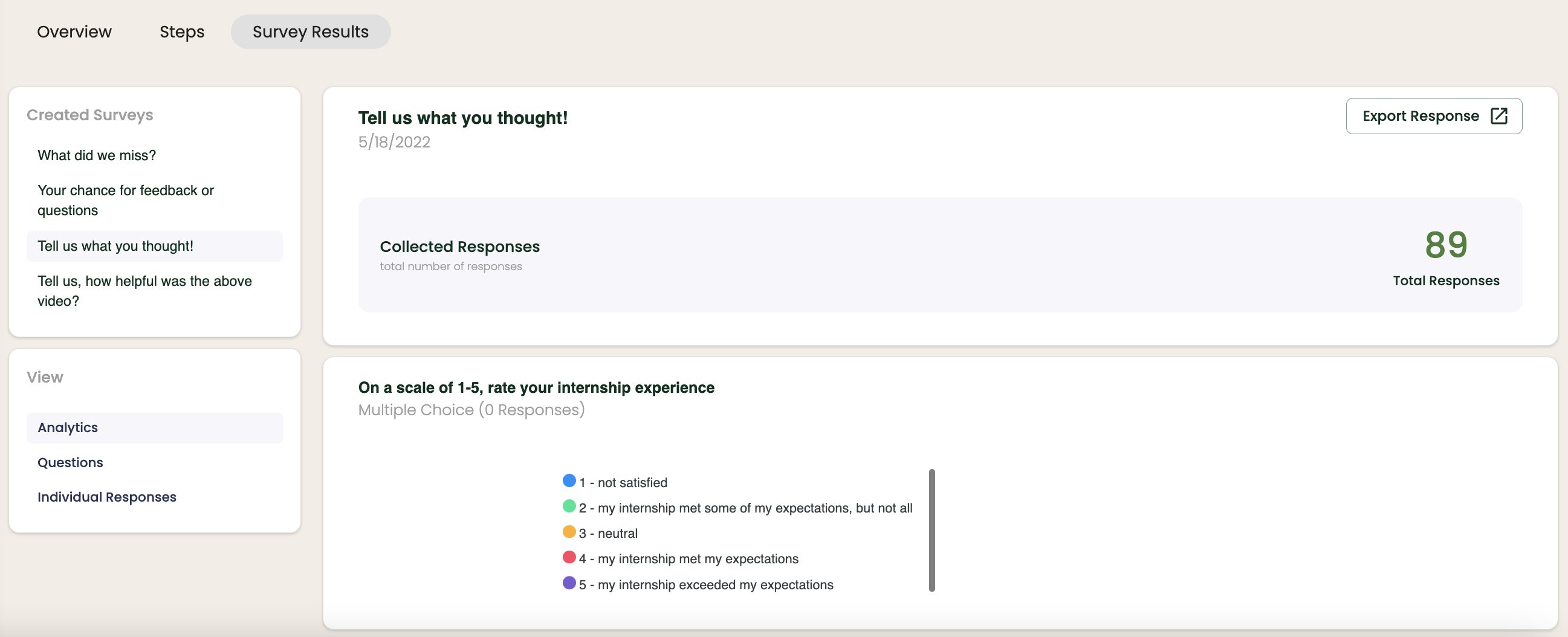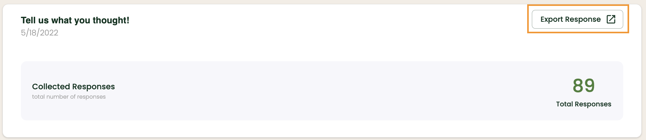 In addition to viewing the data within the platform, you will always be able to export a CSV file for each Survey as well. Simply click the Export Response button in the upper right hand corner to start the instant download.